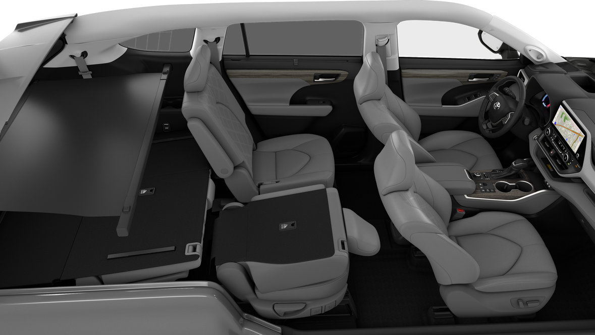 - 7-passenger seating with second-row fold-down captain's chairs and fold-down inboard armrests, adjustable headrests and two cup holders mounted on the floor; and 60/40 split, fold-flat third-row seats with sliding headrests and recline function