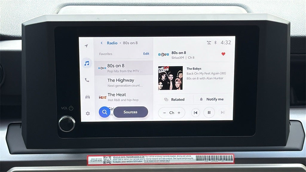 - 8-in. Toyota Audio Multimedia display with 6-speaker audio system, wireless Apple CarPlay® & Android Auto™ compatibility, SiriusXM® 3-month trial subscription. See toyota.com/connected-services for details.