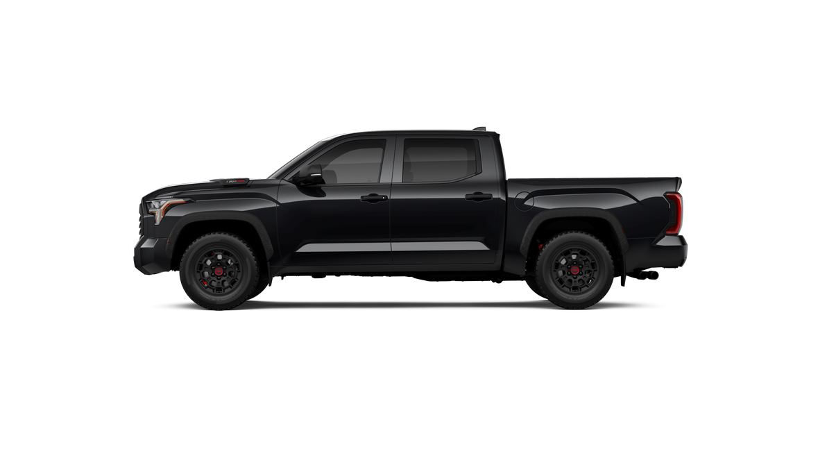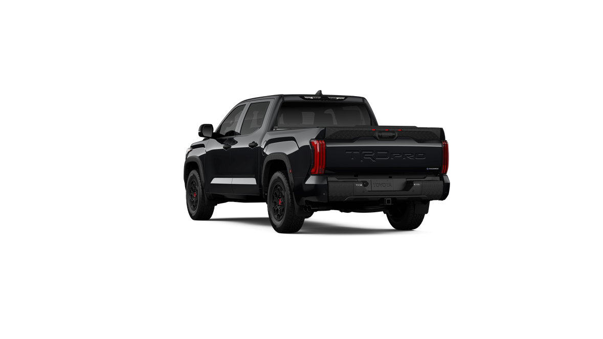 - "TRD PRO" hood badge; black door handles; black window molding and mirror caps; black technical-camo-grained tailgate spoiler and overfenders with marker lights